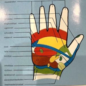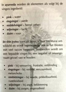Op de foto’s kun je lezen waar de pink,(water) ringvinger,(aarde) middelvinger, ( hemel, ether), wijsvinger (lucht), en duim, (Vuur) voor staan. En de andere foto, waar de organen zich bevinden in je hand, vingers.