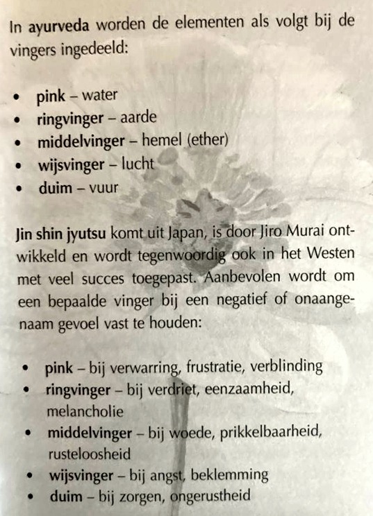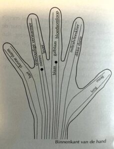 Op de foto’s kun je lezen waar de pink,(water) ringvinger,(aarde) middelvinger, ( hemel, ether), wijsvinger (lucht), en duim, (Vuur) voor staan. En de andere foto, waar de organen zich bevinden in je hand, vingers.
