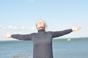 Ga staan met de voeten op heupbreedte. Breng je aandacht naar de adem. Wees je bewust van de inademing en wees je bewust van de uitademing.  Armen langs het lichaam. Aandacht naar de handen, en breng deze op de inademing zijwaarts wijd omhoog, boven het hoofd de handpalmen tegen elkaar en breng de handen bij de uitademing voor de borst en buik naar omlaag.