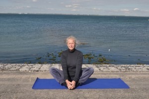 Ga zitten in kleermakershouding, en ga recht op de zitbeentjes zitten. Dit kun je doen door jezelf iets op te tillen, en met een plofje neer te komen. Zet de voetzolen tegen elkaar. Til de knieën wat omhoog en laat ze vallen, doe dit achterelkaar.