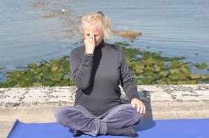 Adem in door rechts , verplaats de duim, en adem uit door links, dan weer adem in door links, verplaats de duim en adem uit door rechts en zo ga je verder. Breng de adem naar hoog in je neus, eigenlijk naar het punt tussen de wenkbrauwen en adem ook steeds weer helemaal uit.